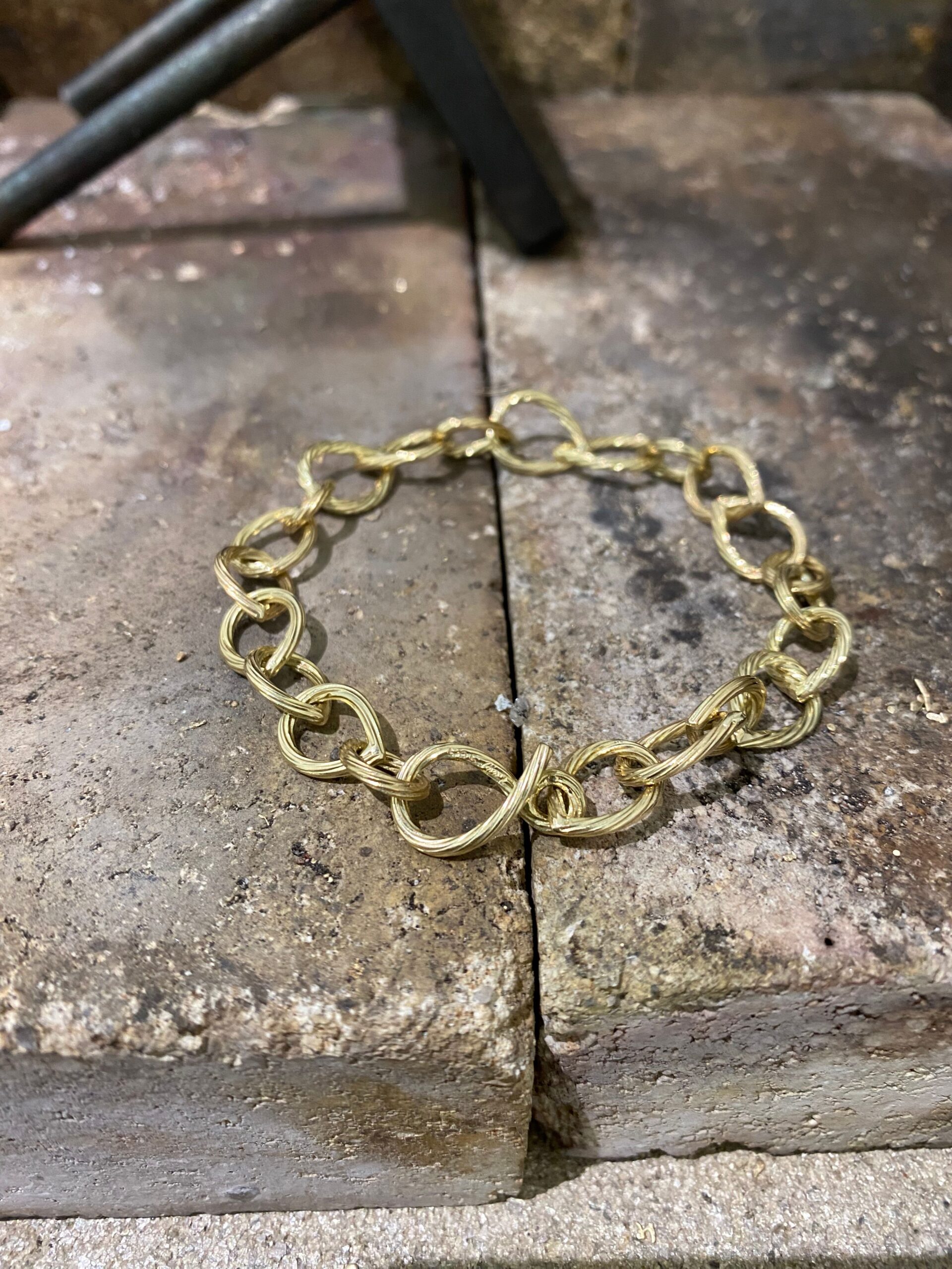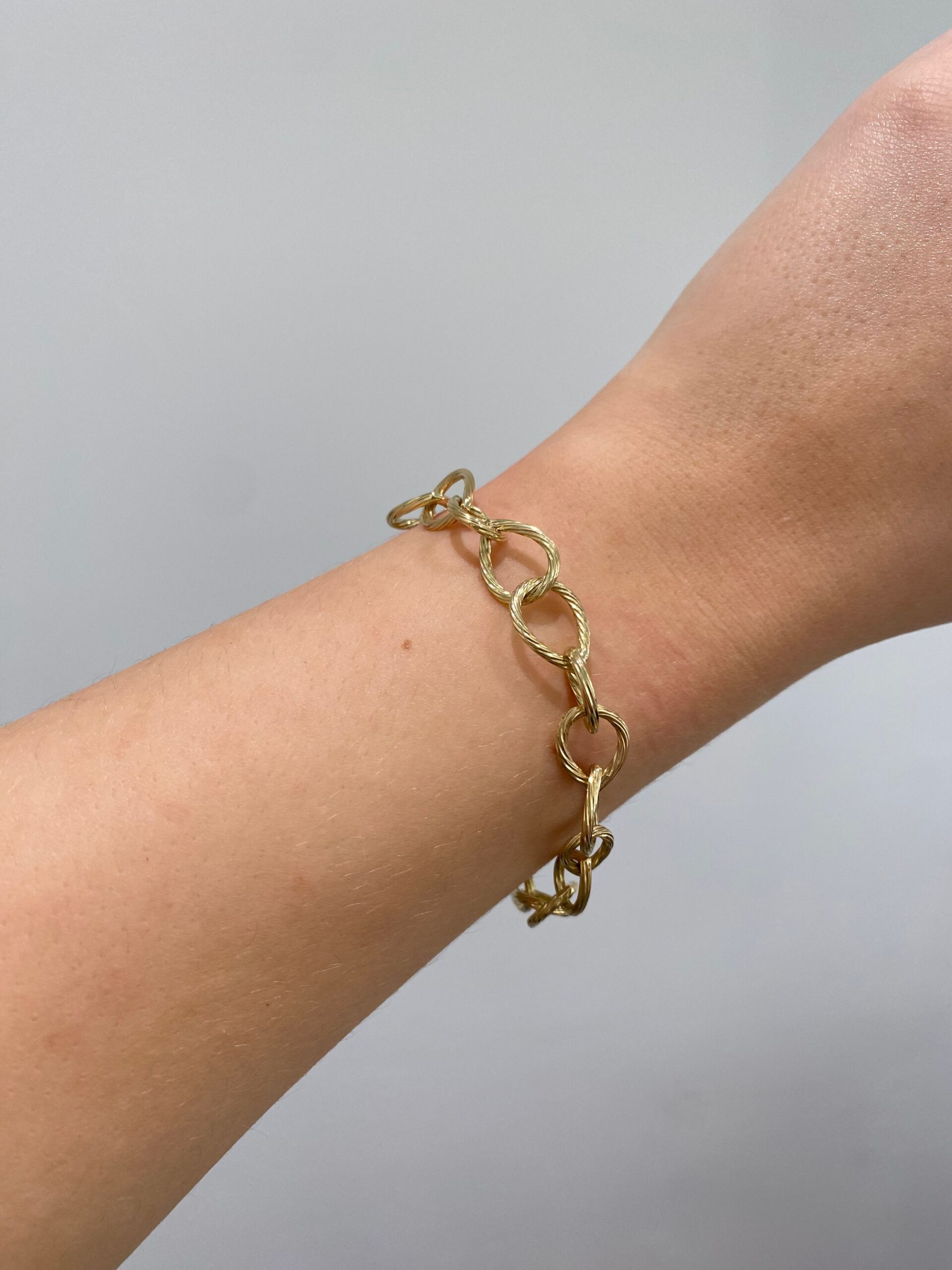 Armbånd i 14 kt. twisted guldtråd med dråbeformede led og vores klassiske s-lås.
